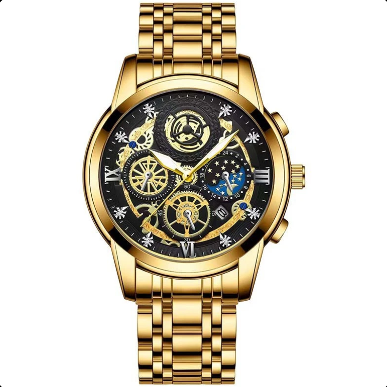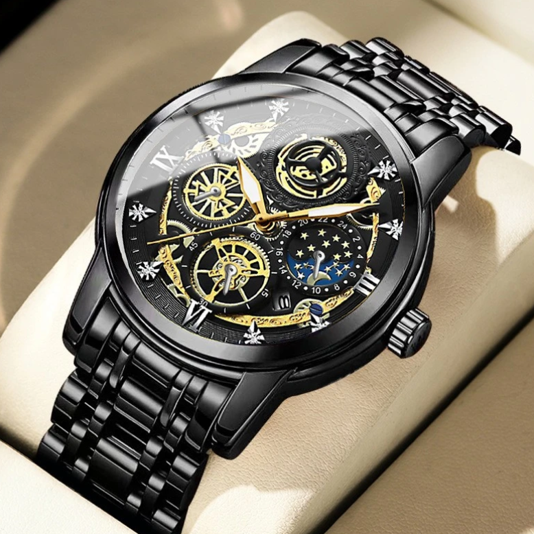Luxury Skeleton Men Quartz Watch: This BINBOND quartz watch has a unique design that brings out the skeletonized vision that only automatic watches have. And the diamond indexes instead of the traditional numerical indexes highlight the business and luxury of the watch. With its chronograph function, moon phase window and calendar window, it is a stylish watch with multiple functions. This. So so. This. So so